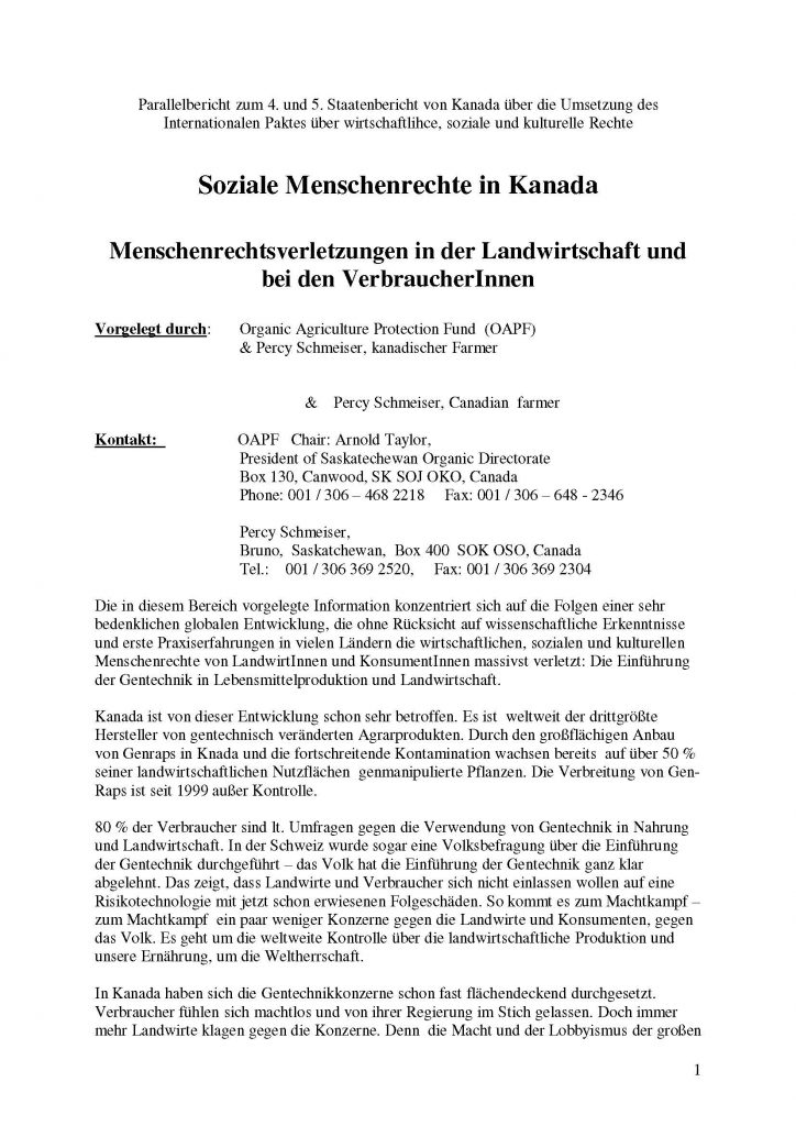 Vorgelegt durch: Organic Agriculture Protection Fund (OAPF)& Percy Schmeiser, kanadischer Farmer & Percy Schmeiser, Canadian farmer